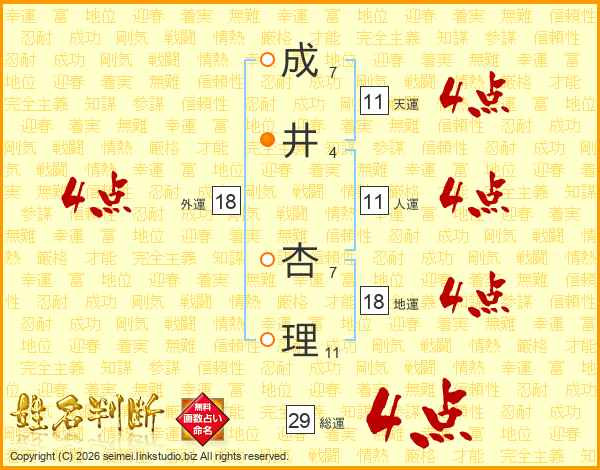あなたの人生を表す1番重要な運勢です。生涯を通じて影響する総合運となり、主に50歳以降の晩年期に影響を及ぼします。苗字と名前の合計画数。