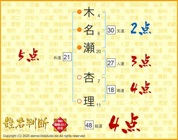 木(4画)名(6画)瀬(20画) 杏(7画)理(11画)