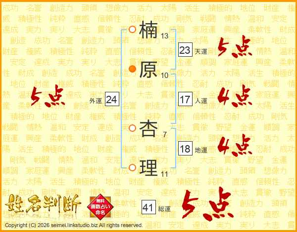 生活面を象徴する運勢です。外部から受ける影響力を表し、結婚運、家庭運や職場、環境への順応性を表します。総運から人運を引いた画数。姓や名が1文字の場合を除く。