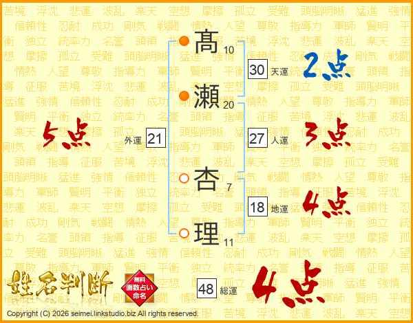髙(10画)瀬(20画) 杏(7画)理(11画)