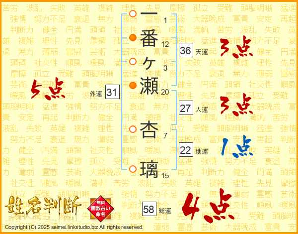 一番ヶ瀬杏璃さんの総運は58画の4点!