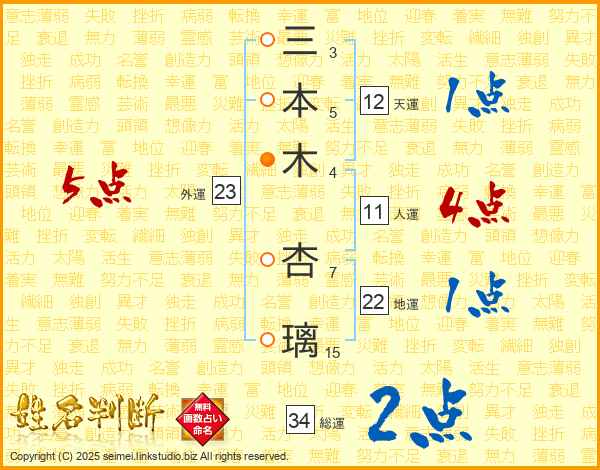 三(3画)本(5画)木(4画) 杏(7画)璃(15画)