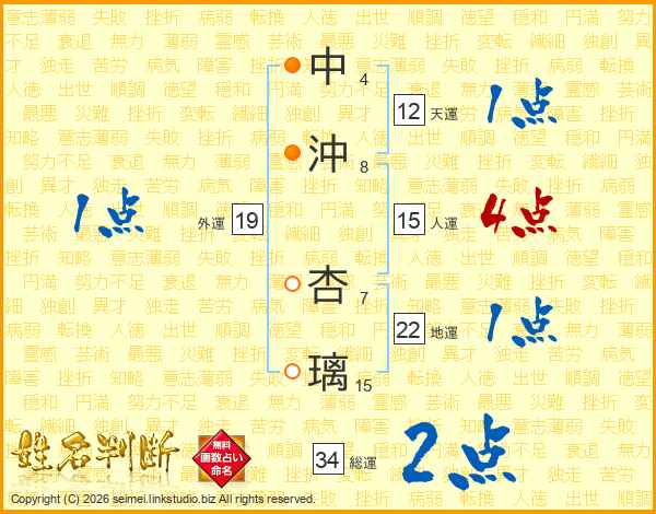中(4画)沖(8画) 杏(7画)璃(15画)