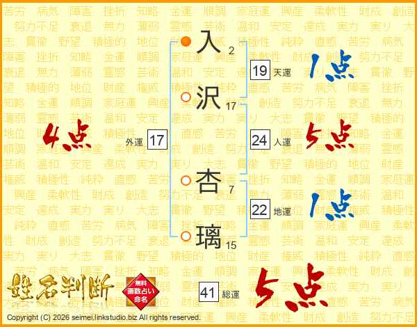 入沢杏璃さんの総運は41画の5点!