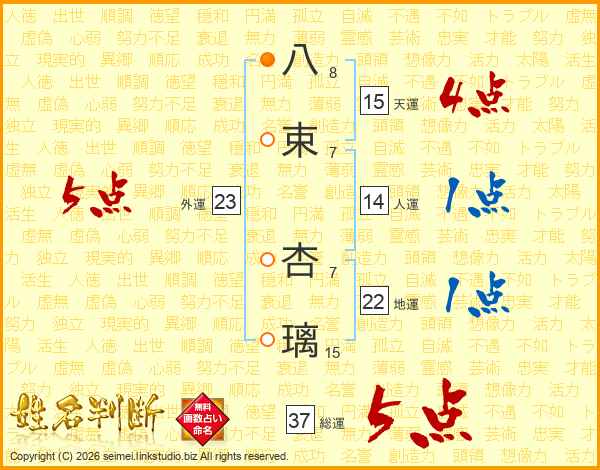 八束杏璃さんの総運は37画の5点!