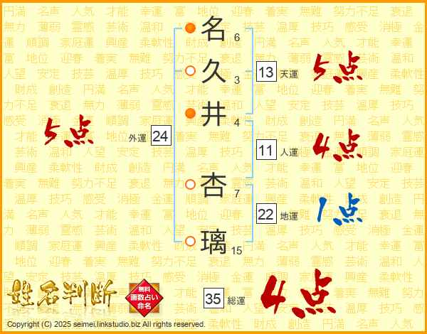 名(6画)久(3画)井(4画) 杏(7画)璃(15画)