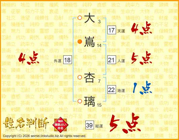 大嶌杏璃さんの総運は39画の5点!