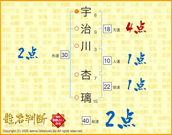 宇(6画)治(9画)川(3画) 杏(7画)璃(15画)