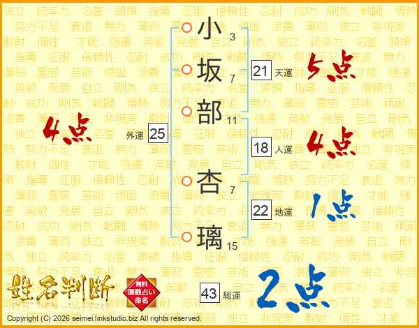 小(3画)坂(7画)部(11画) 杏(7画)璃(15画)