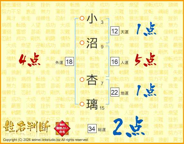 小(3画)沼(9画) 杏(7画)璃(15画)
