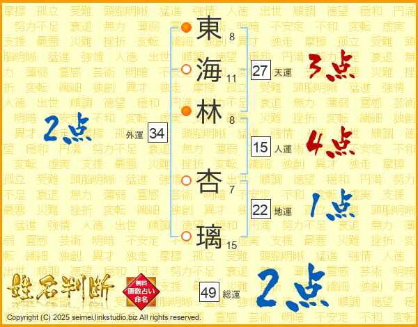 東(8画)海(11画)林(8画) 杏(7画)璃(15画)