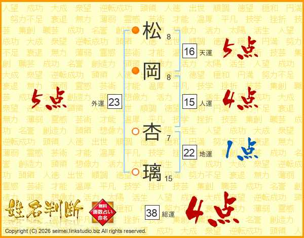 松岡杏璃さんの総運は38画の4点!