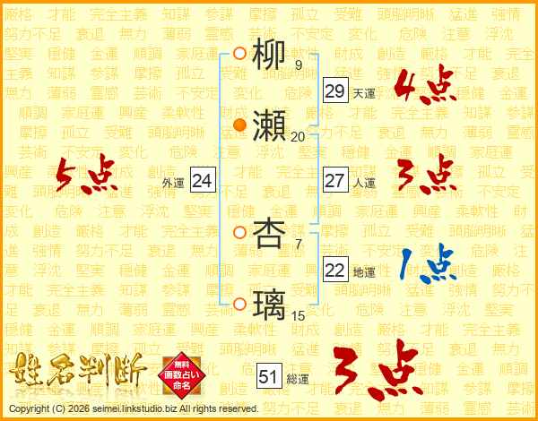 柳(9画)瀬(20画) 杏(7画)璃(15画)