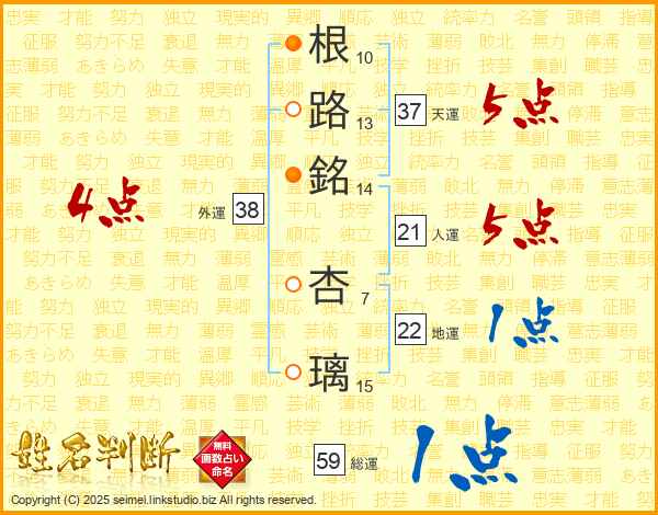 根路銘杏璃さんの総運は59画の1点!