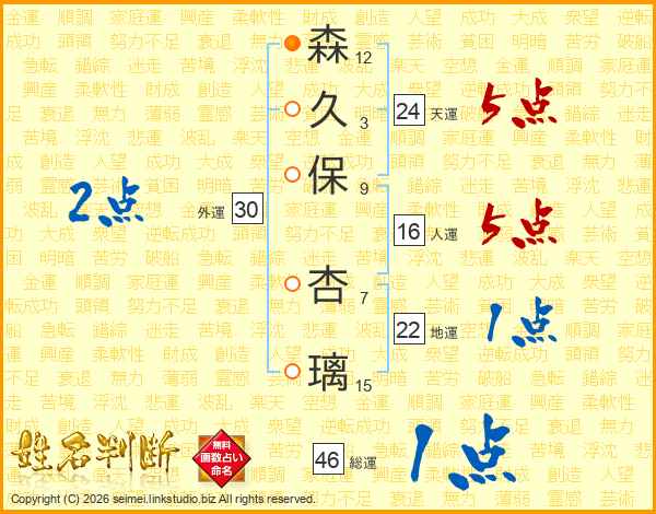 森(12画)久(3画)保(9画) 杏(7画)璃(15画)