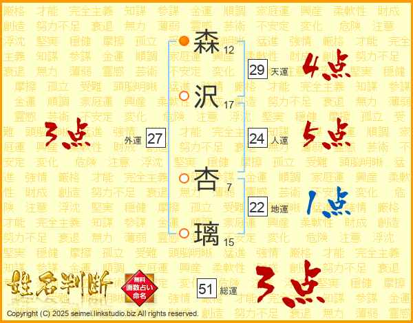 森(12画)沢(17画) 杏(7画)璃(15画)
