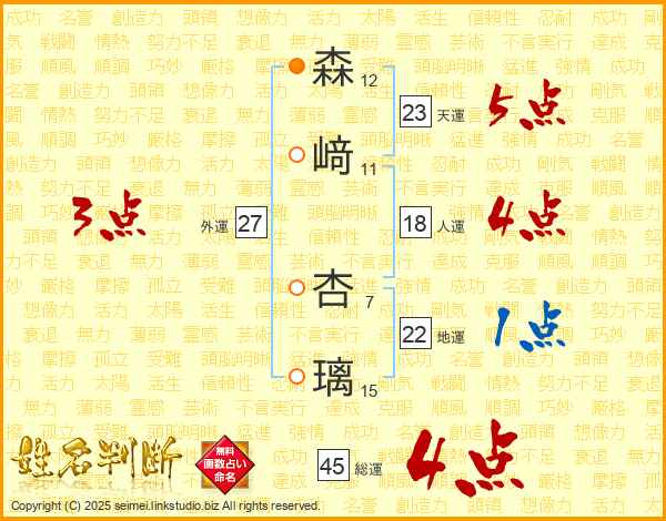 森﨑杏璃さんの総運は45画の4点!