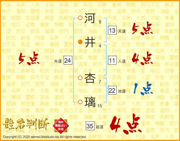 生活面を象徴する運勢です。外部から受ける影響力を表し、結婚運、家庭運や職場、環境への順応性を表します。総運から人運を引いた画数。姓や名が1文字の場合を除く。