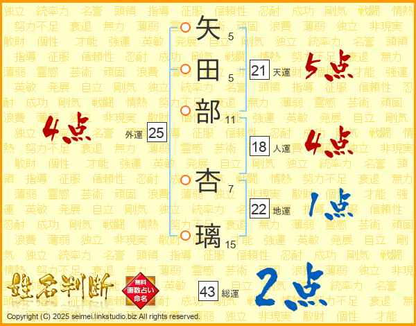 矢田部杏璃さんの天運は21画の5点!