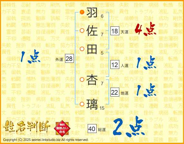 羽佐田杏璃さんの天運は18画の4点!
