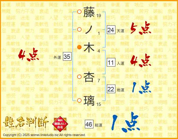 藤(19画)ノ(1画)木(4画) 杏(7画)璃(15画)