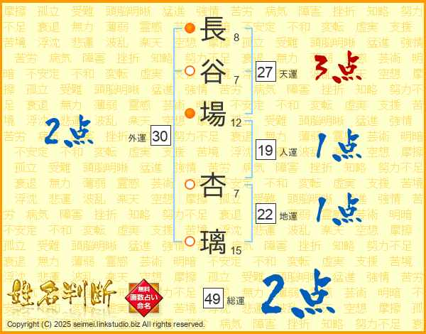 長(8画)谷(7画)場(12画) 杏(7画)璃(15画)