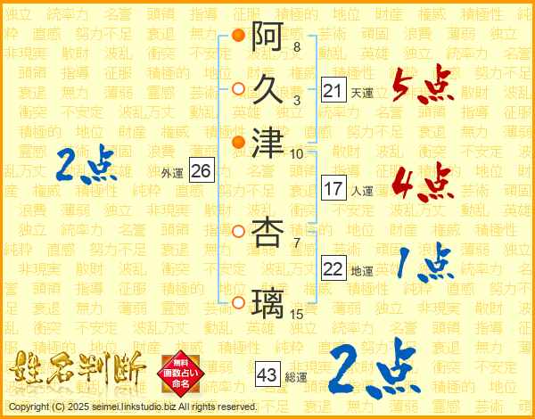 阿(8画)久(3画)津(10画) 杏(7画)璃(15画)