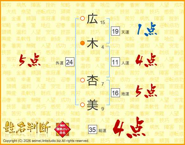 広(15画)木(4画) 杏(7画)美(9画)