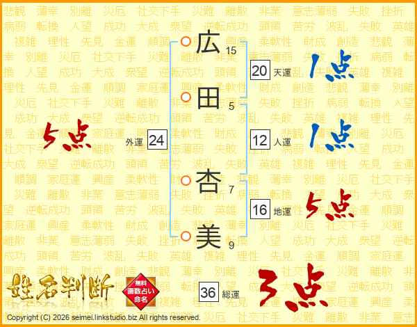 広(15画)田(5画) 杏(7画)美(9画)