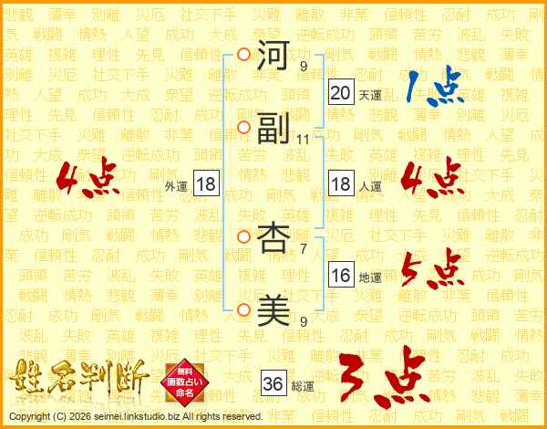 生活面を象徴する運勢です。外部から受ける影響力を表し、結婚運、家庭運や職場、環境への順応性を表します。総運から人運を引いた画数。姓や名が1文字の場合を除く。