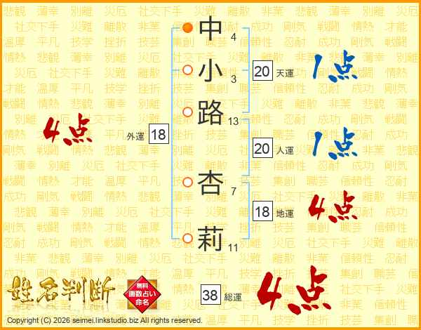 中(4画)小(3画)路(13画) 杏(7画)莉(11画)