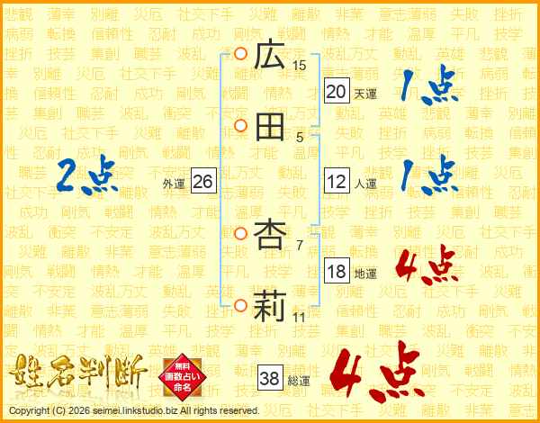広田杏莉さんの総運は38画の4点!