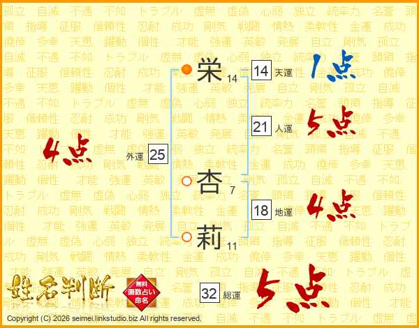 栄(14画) 杏(7画)莉(11画)