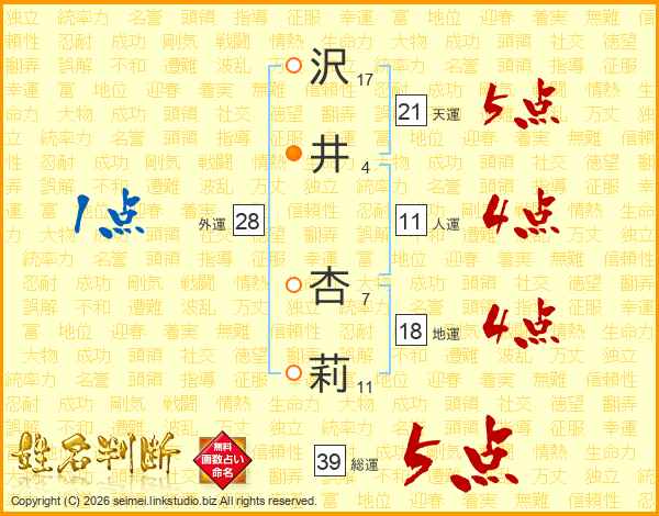 沢井杏莉さんの総運は39画の5点!