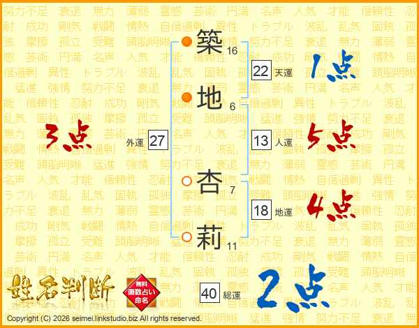 築(16画)地(6画) 杏(7画)莉(11画)