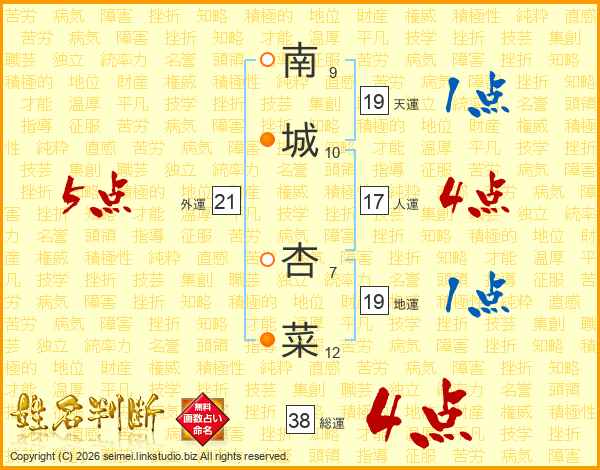 南城杏菜さんの総運は38画の4点!