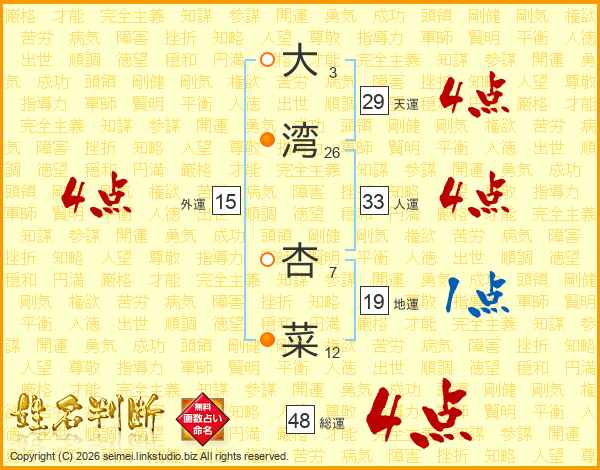 大湾杏菜さんの天運は29画の4点!