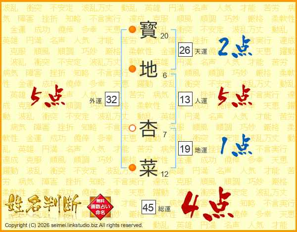 寳地杏菜さんの総運は45画の4点!