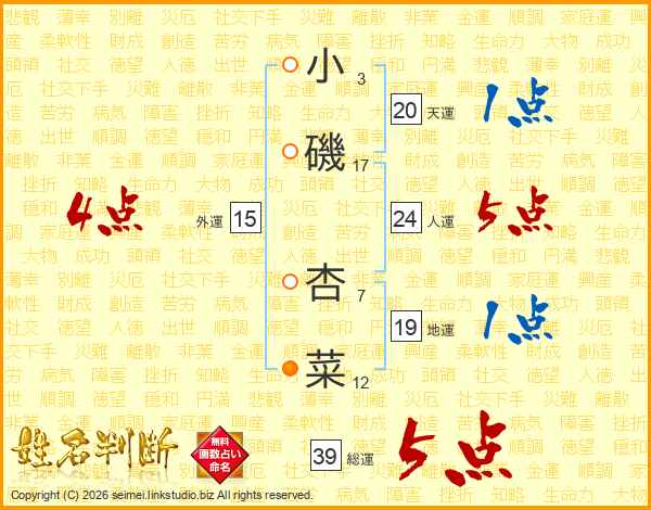 小磯杏菜さんの総運は39画の5点!