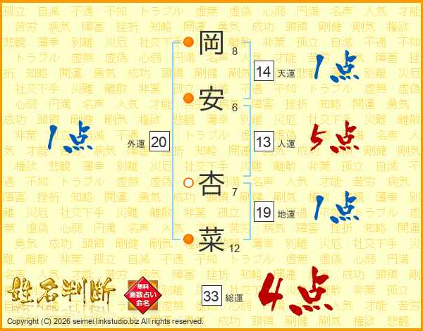 岡(8画)安(6画) 杏(7画)菜(12画)