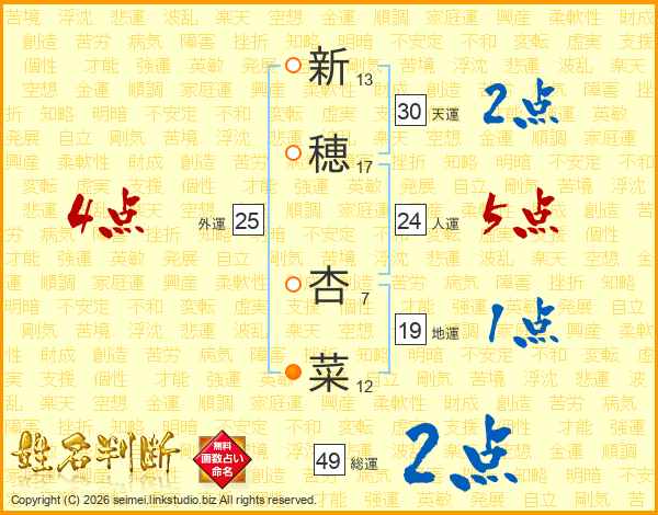 新(13画)穂(17画) 杏(7画)菜(12画)
