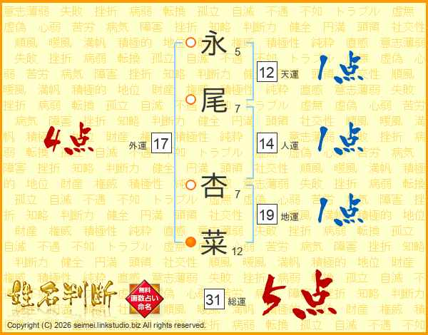 永(5画)尾(7画) 杏(7画)菜(12画)