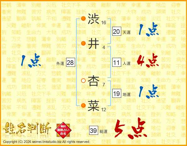 渋(16画)井(4画) 杏(7画)菜(12画)