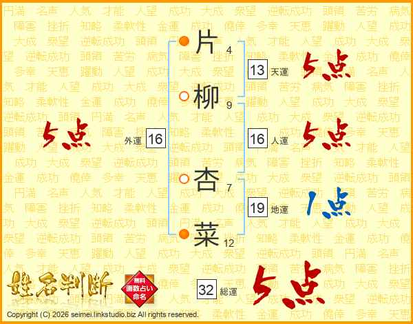 片柳杏菜さんの総運は32画の5点!