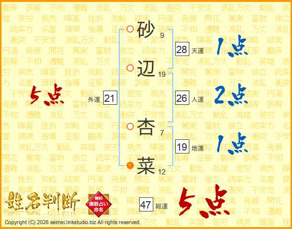 砂辺杏菜さんの総運は47画の5点!