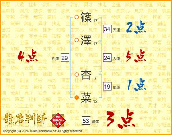 篠(17画)澤(17画) 杏(7画)菜(12画)