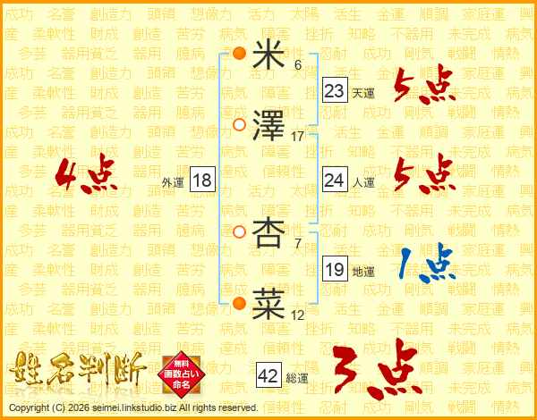 米(6画)澤(17画) 杏(7画)菜(12画)