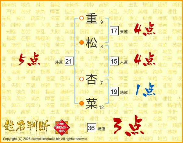 重松杏菜さんの総運は36画の3点!