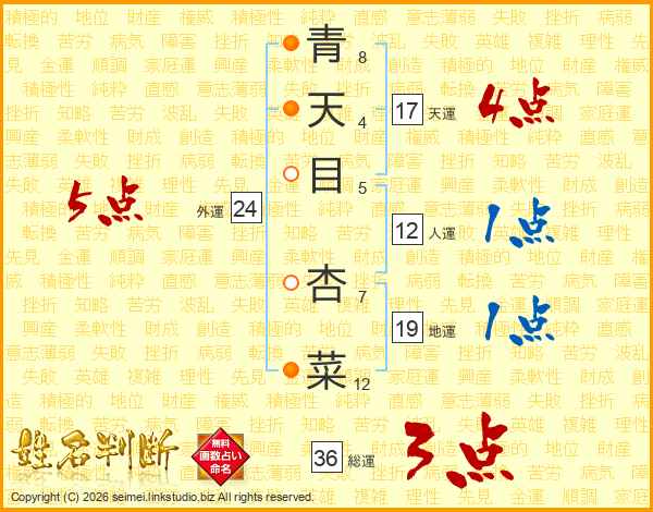 青(8画)天(4画)目(5画) 杏(7画)菜(12画)
