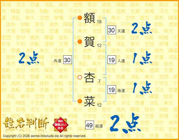 額(18画)賀(12画) 杏(7画)菜(12画)
